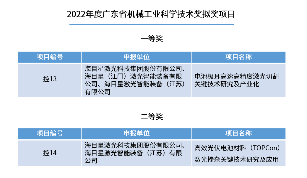 近日,廣東省機械工程學會通過官方渠道公示2022年度廣東省機械工業科學技術獎獲獎項目,海目星申報的《電池極耳高速高精度切割關鍵技術研究及產業化》《高效光伏電池材料(TOPCon)激光摻雜關鍵技術研究及應用》項目分獲科學技術獎一、二等獎。